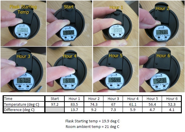 Temperature wise I’ll let you judge for yourself. I concentrated on the heat aspect as that’s what will be the Flip Lid’s main draw. I carried out the test below using boiling water from the kettle, I didn’t pre-warm the flask, which is best practice for long term heat retention.
