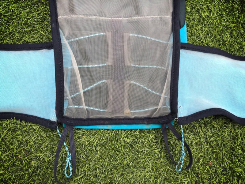 Up front you have two smaller zipped pockets at the shoulders, one the afore mentioned tracker pocket. Below that you have a single bottle pocket on your right, which holds the 500ml body bottle soft flask included with the vest. This pocket includes a cinch cord around the top, so you can securely hold the flask regardless of how much fluid is in it.