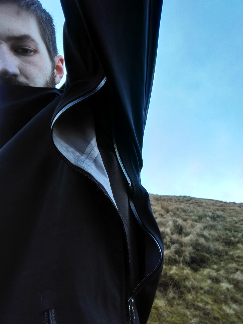 The jacket is breathable and as I mentioned above with the fleece in combination, I didn’t have any issues with over heating or sweating when hiking up a Tor or mountain. The jacket has two very large! 30cm openings below the armpits which is great and when it’s not raining does a good job at keeping you cooler. However, with no mesh or further protection on these openings, you better remember to close them off when it does rain as you may find water leaks in.