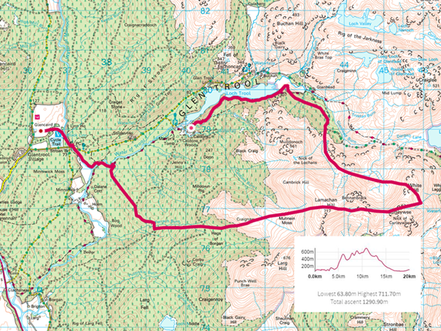 We step up to the line at 07:10, we then step forward to the next line and receive our map. I fold away the top half as there are no controls on it and quickly scan the route. The horn blows again and we move in to the final line of departure. A quick discussion of the initial route which is a pleasant shuffle along the southern bank of Loch Trool. On finding this control we then had to decide if we would drop back to the path we made the short climb up to or push up to the tree line that held another path to the next objective. I was keen to go up, I think Richard may have wanted to save my legs but I was keen not to loose height gained and I now I had a more dialed in approach to the way my body burned fuel. I was conscious of my quads and calf's tensing and cramping but I was okay. Lets go up the mountaineer in me called.