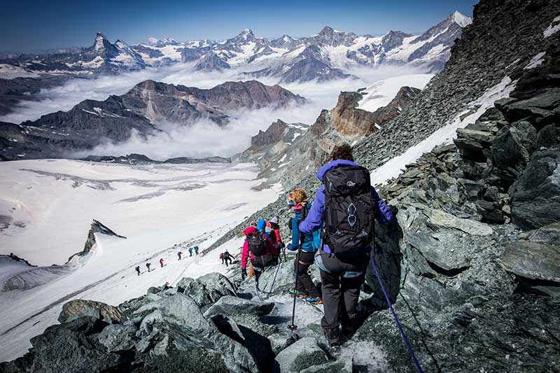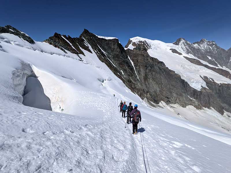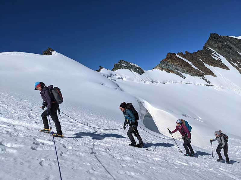 What would it be like to climb your first 4000m alpine peak – with a group of women you’ve never climbed with before?  Turns out it was a brilliant (and rather efficient) way of alpine acclimatisation starting at 3,457m above sea level, and a speedy reintroduction to glacial travel in the Swiss Alps.