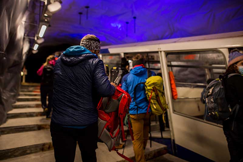 We were on the highest funicular railway in the world, about to commute to the glacier and begin our ascent of Allalinhorn, 4,027m. With it being underground, it also happened to be the highest subway in the world. Zooming up from 2,980m from Felskinn to the Mitteallalin station at a dizzying 3,456m, we left behind crumbling grey moraine fields and turquoise blue glacial lakes formed due to receding Fee glacier.  The tunnel we had travelled through – all 1,749m of it – was the very epitome of Swiss pride in their attitudes to an efficient transport system.  Seemingly defying gravity, the metro train got us from the last of the cable car sections to our destination, its speedy efficiency as prompt as its very first debut when launched in 1984. There was quite simply, enough tech to satisfy any engineer geek as we commuted to the glacier in the swiss style, both efficiently and on time.