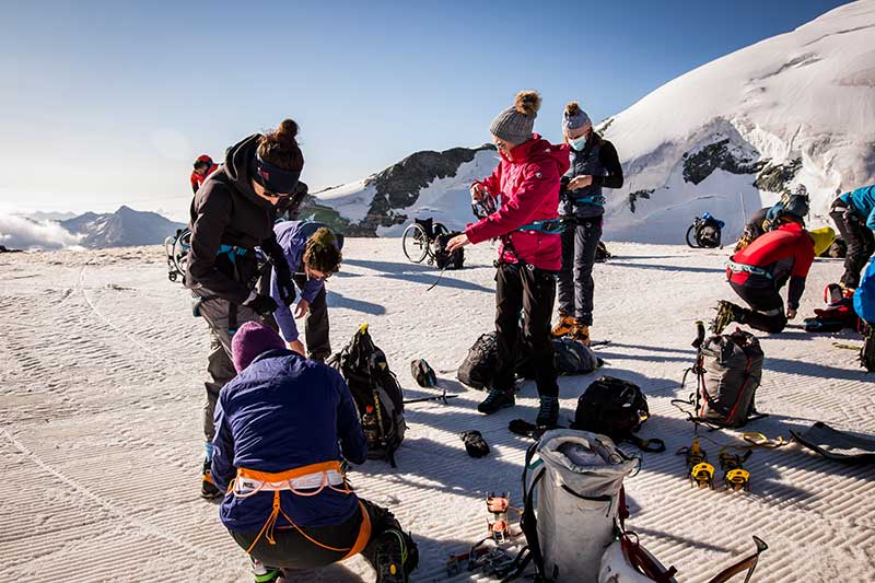 Participants fastening the harnesses and crampons ahead of the My first 4000er peak AllalinhornjpgParticipants fastening the harnesses and crampons ahead of the My first 4000er peak – Allalinhorn.