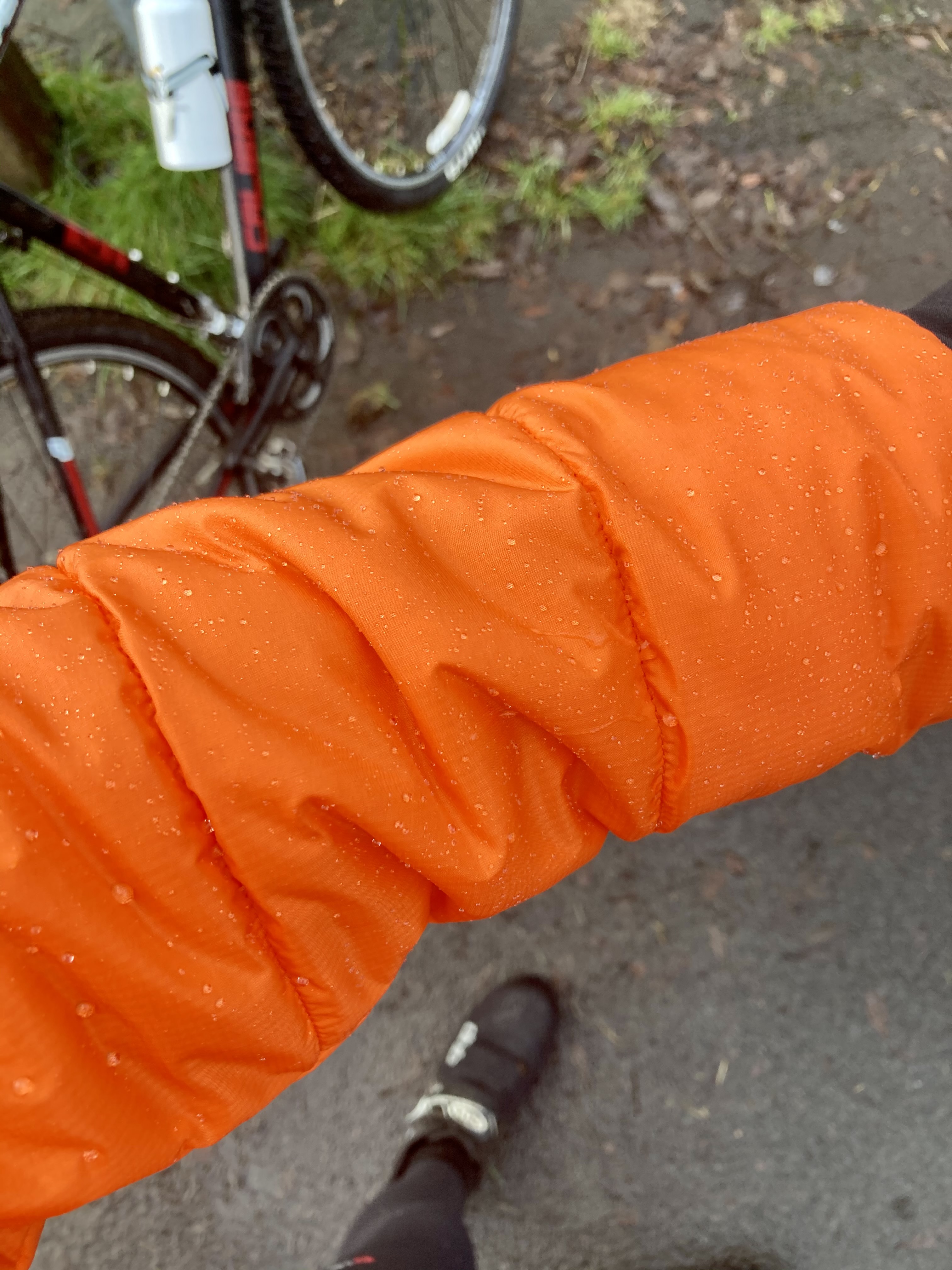 Synthetic insulation whilst not providing the same warmth to weight ratio of down is still light enough and arguably more practical for the demands of cycling, whilst the nylon the outer shell shows a high level of water repellence. I tested the jacket in the wet rain of South Wales and I remained warm with very little ingress of water which works for me.