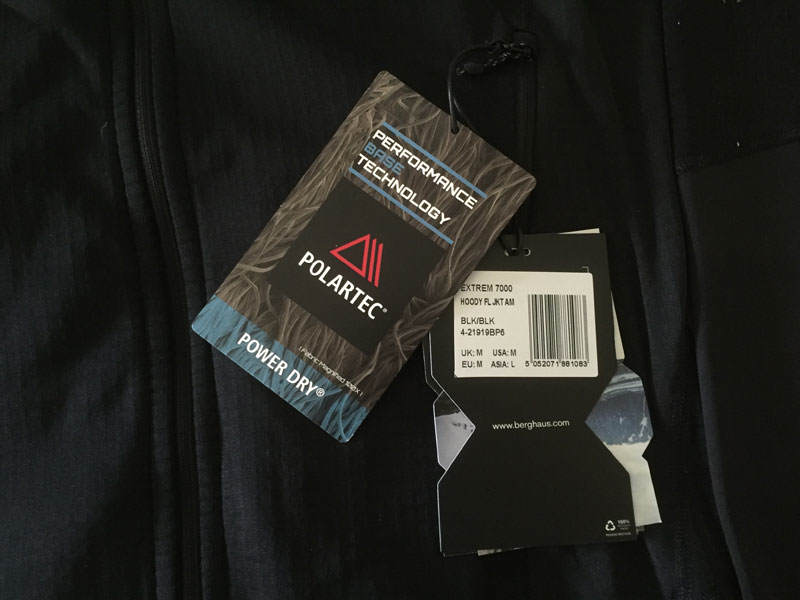 The cut of the Extrem 7000 Hoody is tailored for dynamic movement and the flat locking stitch gives low profile seams, making it a very flexible garment in use but can be a bit of a pain to get on over a base layer. The inner face of the Power Grid fabric has a tendency to grip on baselayer fabrics and bunch up around the upper arm rather than slipping on easily. In addition to providing extra insulation around the body core the heavier duty fabric is also used in heavy wear areas, giving extra durability at rucksack strap contact points.