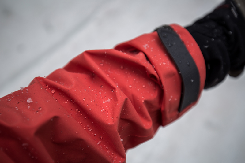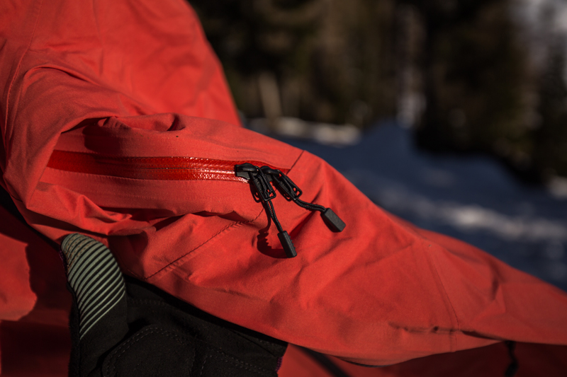 When it gets hot it’s adjustable - Having Velcro straps on the cuffs meant insulation can be kept in, and a longer sleeve in the arm means it’s less likely to have snow/ ice falling down leading to cold clammy skin. Equally, when moving uphill, rolling the sleeves up means heat can be expelled quickly, and the full-length pit zips allow air to easily pass through to keep the ventilation going.