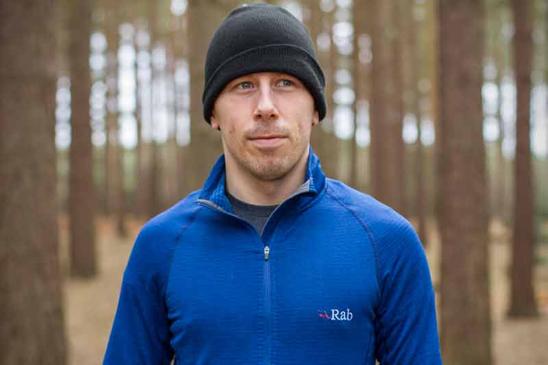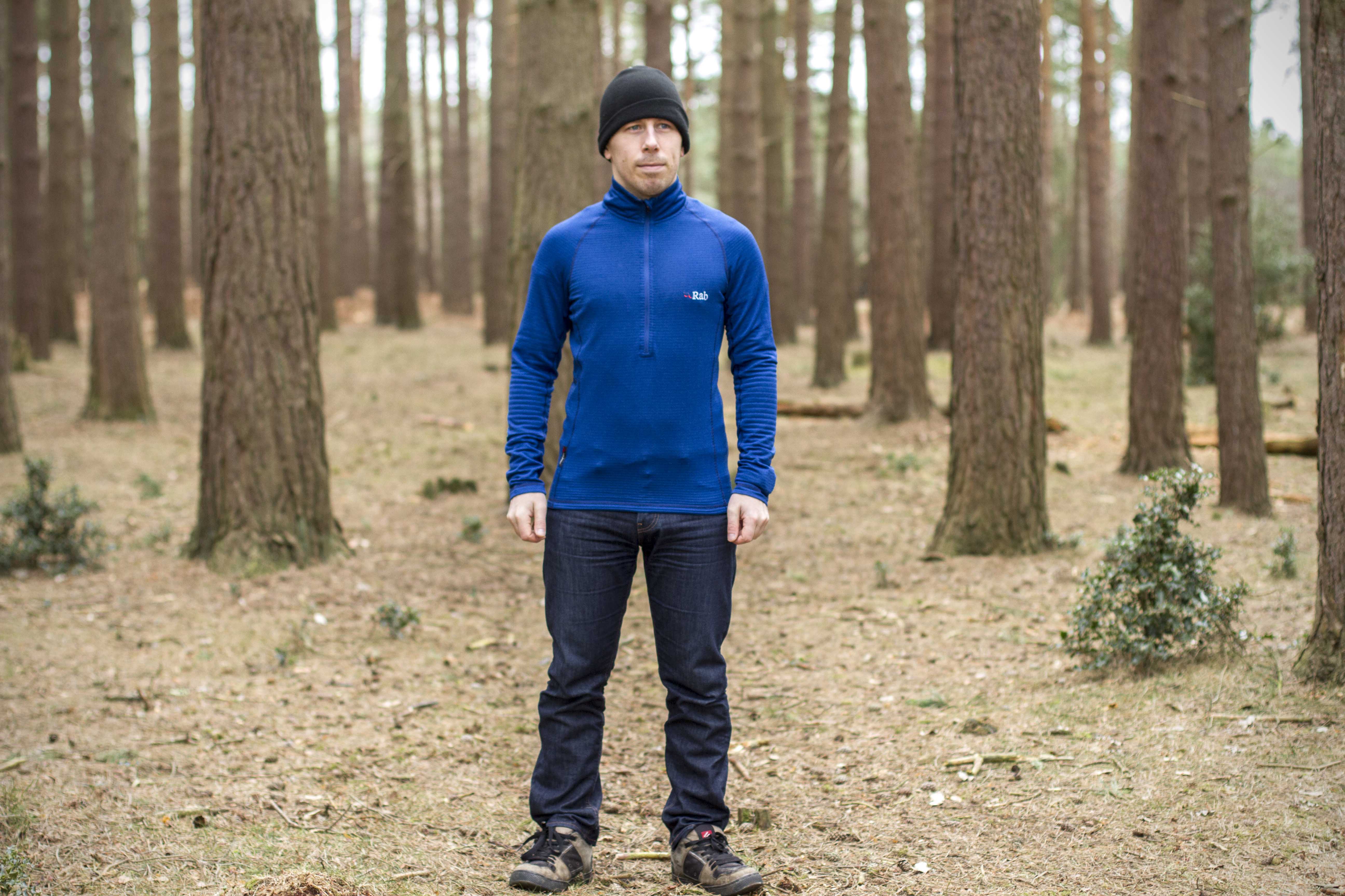 I say it maps the contours of your body because it is a slim fit. I wore a size small, which fitted pretty much perfectly (I do seem to be the size model for Rab small across many years of products), and even if you are a small in regular clothing, the Polartec Power Dry has enough stretch to get over those winter reserves.