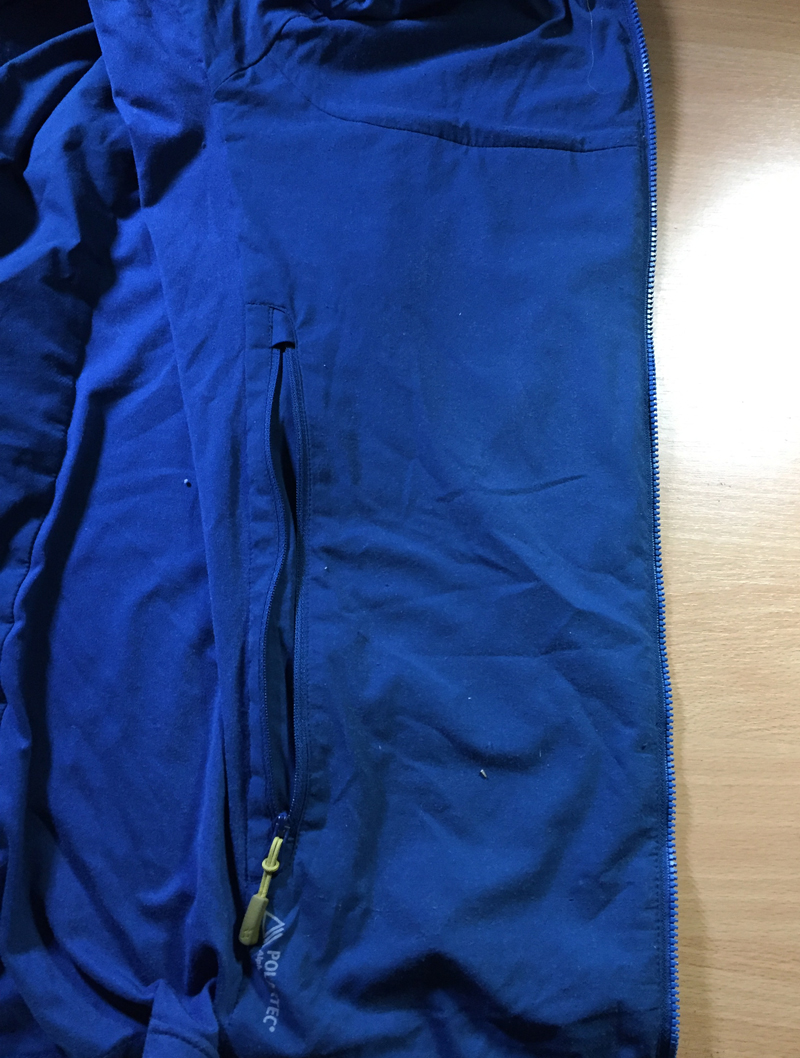 The front hand-warmer pockets take up the majority of the front of the jacket, the whole front panel being more than large enough to take an OS map. Thumb loops and side panels are made from stretch fleece which allows a fit that pulls the fleece close to the body, making the most of the insulation and trapping warm air very efficiently.