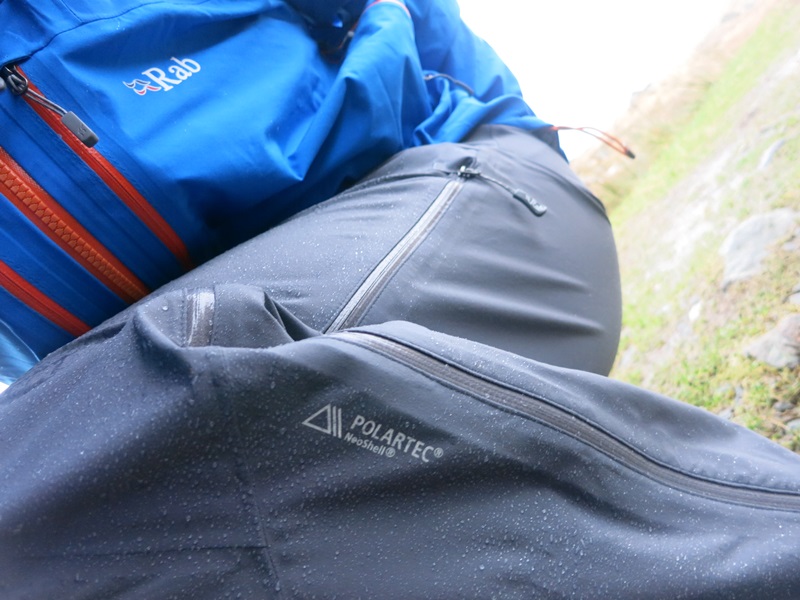 Neoshell sits just over the cusp of the waterproof line so this means that its saturation level will be reached quicker. There was a day in particular where I pushed this limit and the fabric wet out. Now, a point to note at this stage is that all fabric has a limit so this is not something I didn’t anticipate. What Neoshell has going for it is breathability combined with the waterproof barrier, so accept that there are pay offs. The day I mentioned I could see how permeable the fabric is as I saw, literally in front of my eyes, the fabric drying on my legs as the strong wind of that day blew through it. Amazingly the difference between the different fabric deniers could be seen also as the panel on the front of the thigh dried quickly and the section above around the crotch stayed strong. I didn’t quite believe it either and when I saw it happen I wondered how I was going to put it in print but it happened. This could be seen as a negative but, in my opinion, it’s not! It makes the fabric, both garments really, more versatile. Something we’re not short of is rain in this country but we’re also not short of wind either. So if it dries the rain out the fabric than it’ll do it to the sweat too!
