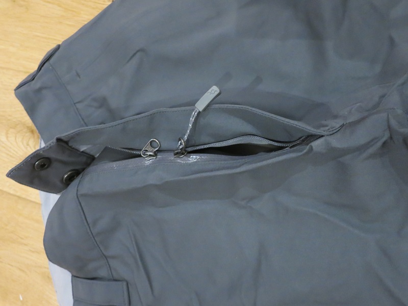 There are ¾ YKK AquaGuard water repellent zips on each leg. These are zipped from the bottom and the top to allow venting.