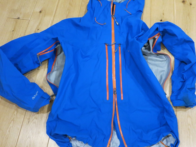 The jacket has the usual mountain shell attributes. Long pit-zips and a big helmet compatible hood. The hood does a good job of downsizing to a secure over the skull also. The wired peak in the hoods skip allows it to be shaped to provide the appropriate directional protection of the prevailing wind.