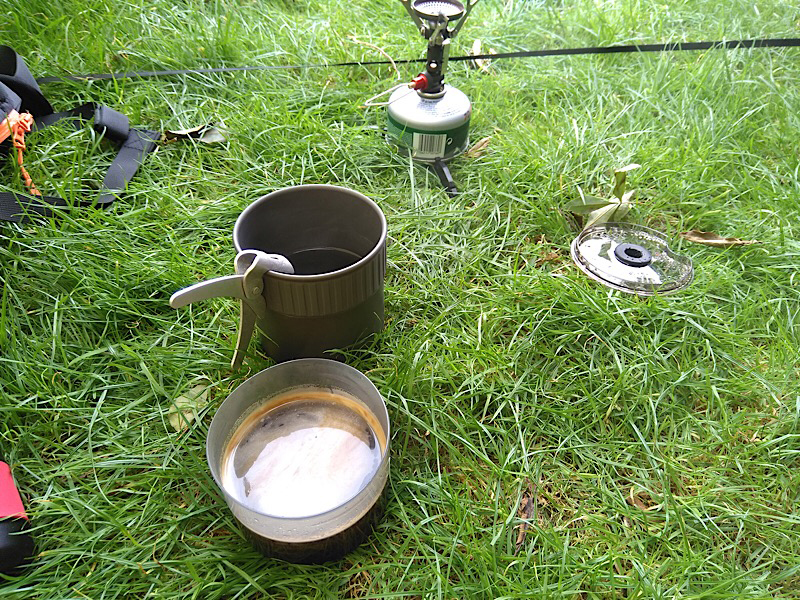 The plastic cup that comes with the pot is interesting in the construction and idea but this as far as I would rate the product. The plastic cup isn’t strong or insulated so if you are using it for hot coffee or tea, care is needed and a pair of gloves to hold the cup, I also noticed with the hot liquids inside the pot would bow but would always return to its shape after. This is just as well, otherwise it would make packing the cooking set back down rather awkward.