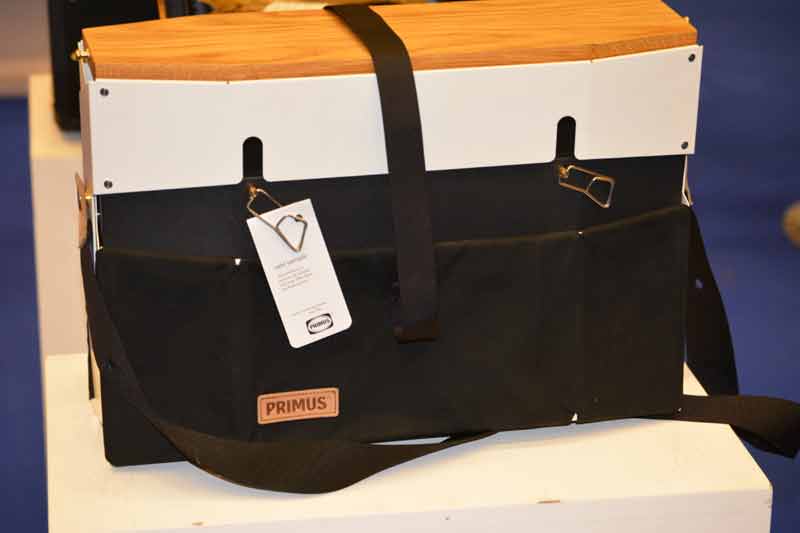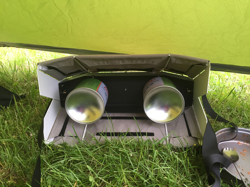 To use the stove simply unclip the shoulder strap, remove the wooden chopping board and pull the sides apart. On opening the sides the centre drops down to leave the burners just below rim height, giving very good wind protection, and the spread sides provide a very stable base.