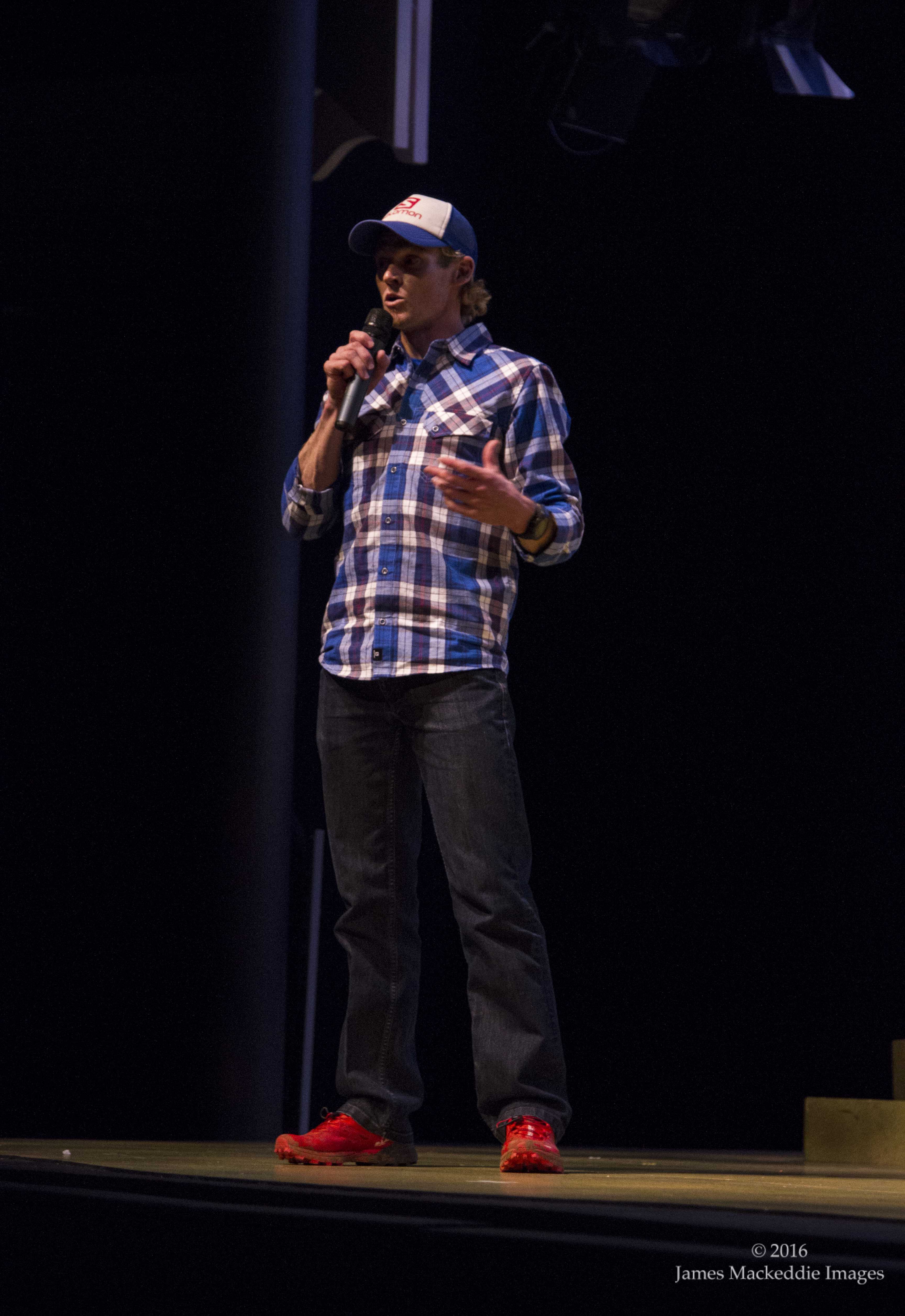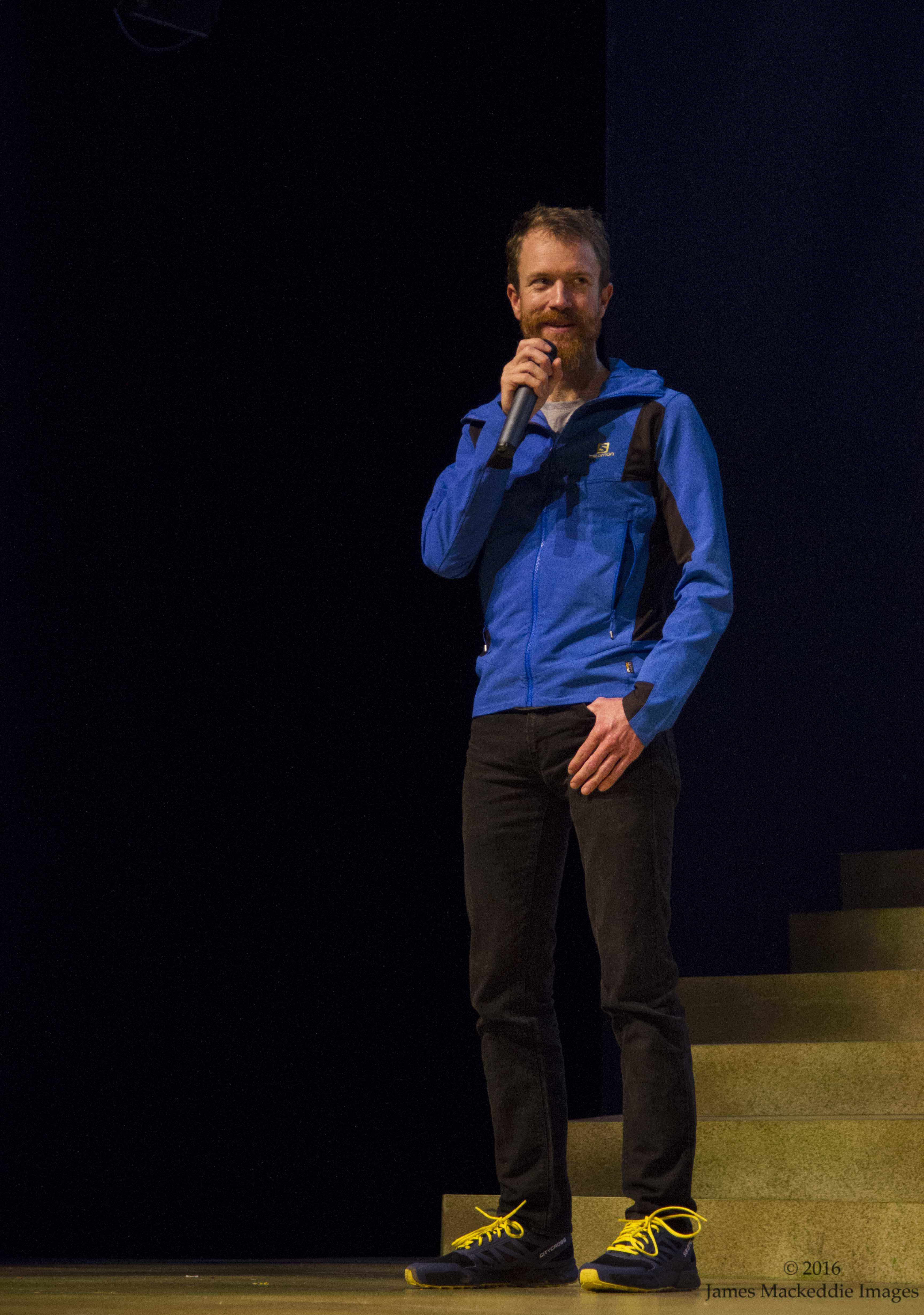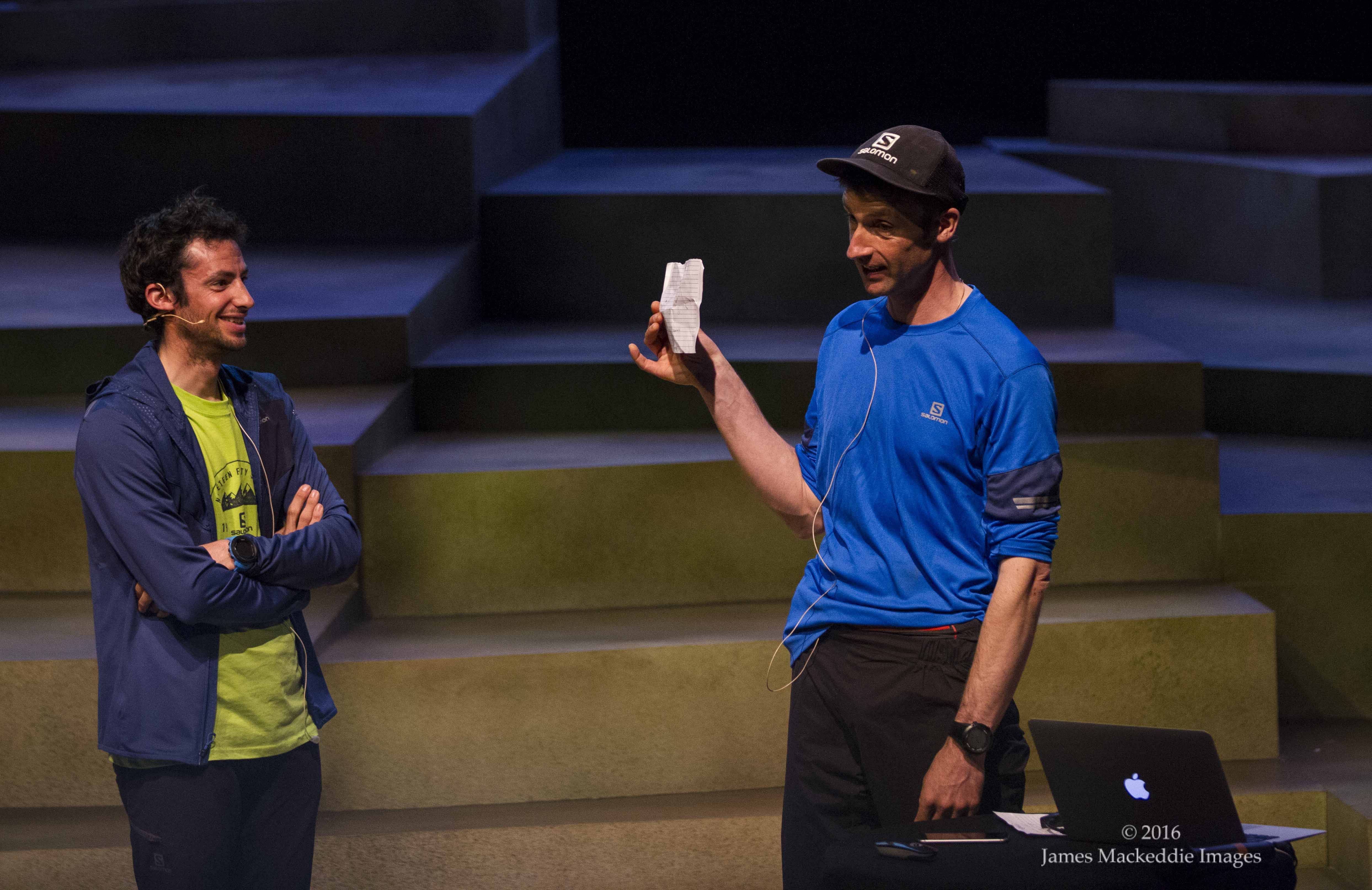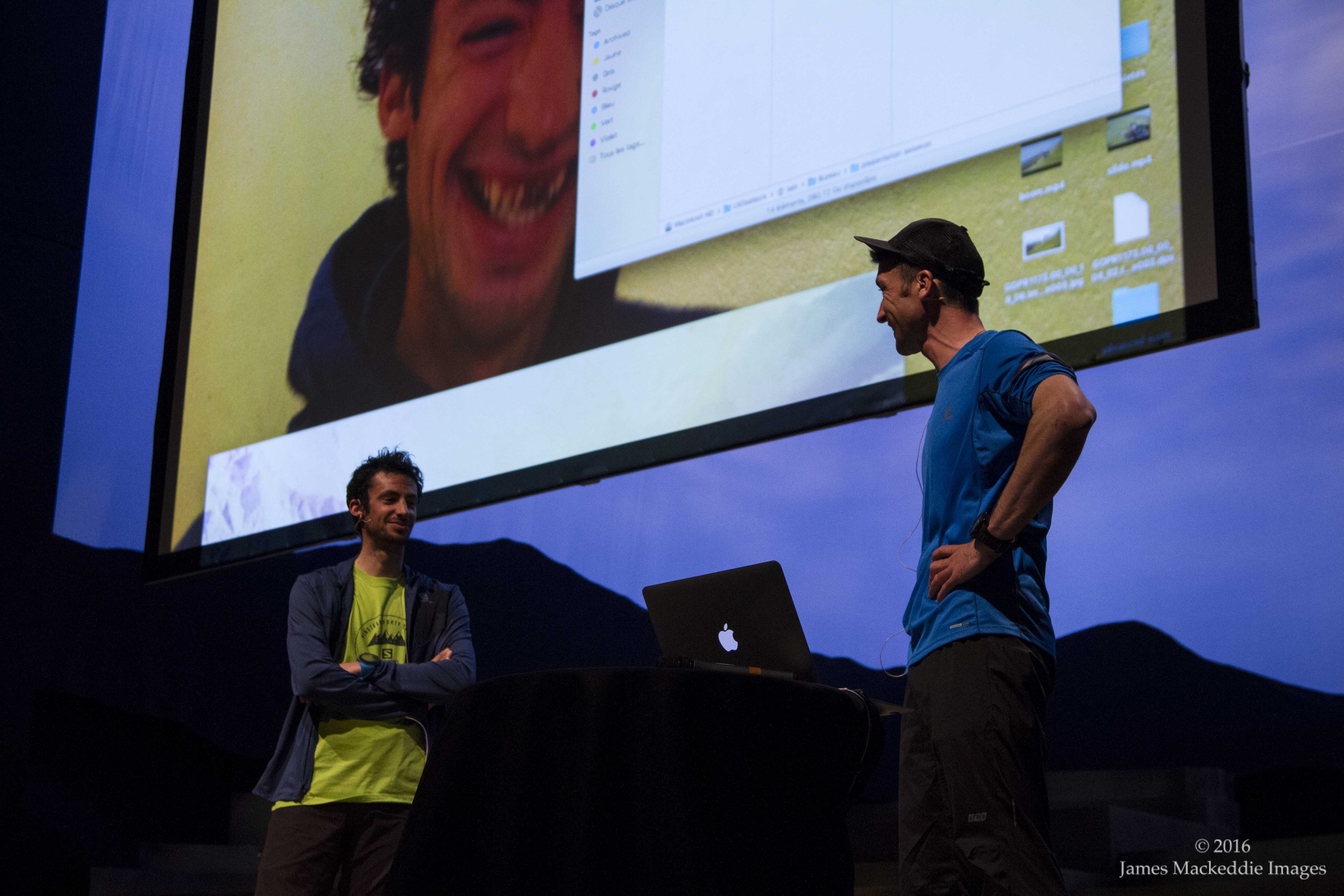 Taking us through the Summits of My Life project, Kilian’s personal quest to set records on several summits including Denali, The Matterhorn and Everest, comedy was evident from the first moments. As Kilian spoke to an expectant crowd, Seb moved the file tab to reveal a picture of Kilian smiling with blackened teeth. With the audience laughing, Kilian looked back to see he was the butt of the joke. And this set up the following half an hour or so. To be honest I lost all sense of time, as the pair entertained and informed, turning the feats of one of the world’s greatest endurance athletes into something greater.