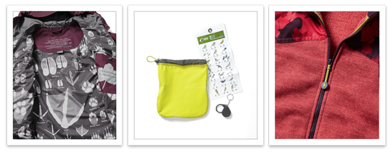 “Each kids' jacket comes with a set of fold out field guides (birds, mammals, butterflies and bugs) and a link to a charitable website where they can learn more about the species they find and identify. There’s a magnifying glass so curious eyes can get a closer view. There’s a ‘wet pocket’, a removable/washable liner which can be used to carry home some of the less savoury finds on a ramble – perfect for skulls and pellets . . . and worse! The lining of each jacket also has a guide to the commoner footprints left by the UK’s mammals and birds. Simply look inside your coat to see if it’s a fox, badger or dog that’s left its mark in the mud!”