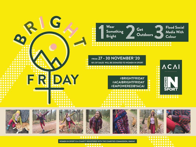 Bright Friday will take place on Friday November 27th and continue over the course of the weekend to Monday November 30th. To participate and help flood social media with positivity and colour, simply pull on your brightest piece of clothing, get outdoors and share a selfie with the hashtag #BrightFriday. Visit the JustGiving page at https://www.justgiving.com/fundraising/bright-friday-acai-outdoorwear-women-in-sport to pledge your support to Women in Sport.