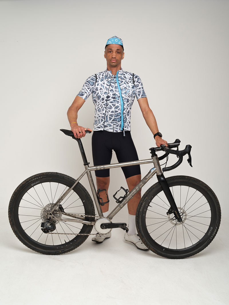 The print for the collection is taken directly from an original painting created by Ball exclusively for Kostüme. It draws on energy patterns found in nature, organic flows and dynamic forms, and is intended to mirror the rhythmic circular motions that relate to riding a bicycle. The print was carefully adapted for use across Kostüme’s high-end recycled technical fabrics, including Polartec Power Shield RPM which is used in the Cargo Gilet. Special attention has been paid to how the colours and lines translate to high-stretch materials.