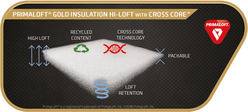PrimaLoft® Gold Insulation with Cross Core™ technology blends the long-standing pinnacle PrimaLoft® Gold Insulation with aerogel to deliver unprecedented lightweight warmth, all while using 90% post-consumer recycled material, up from 35% in the previous version.
