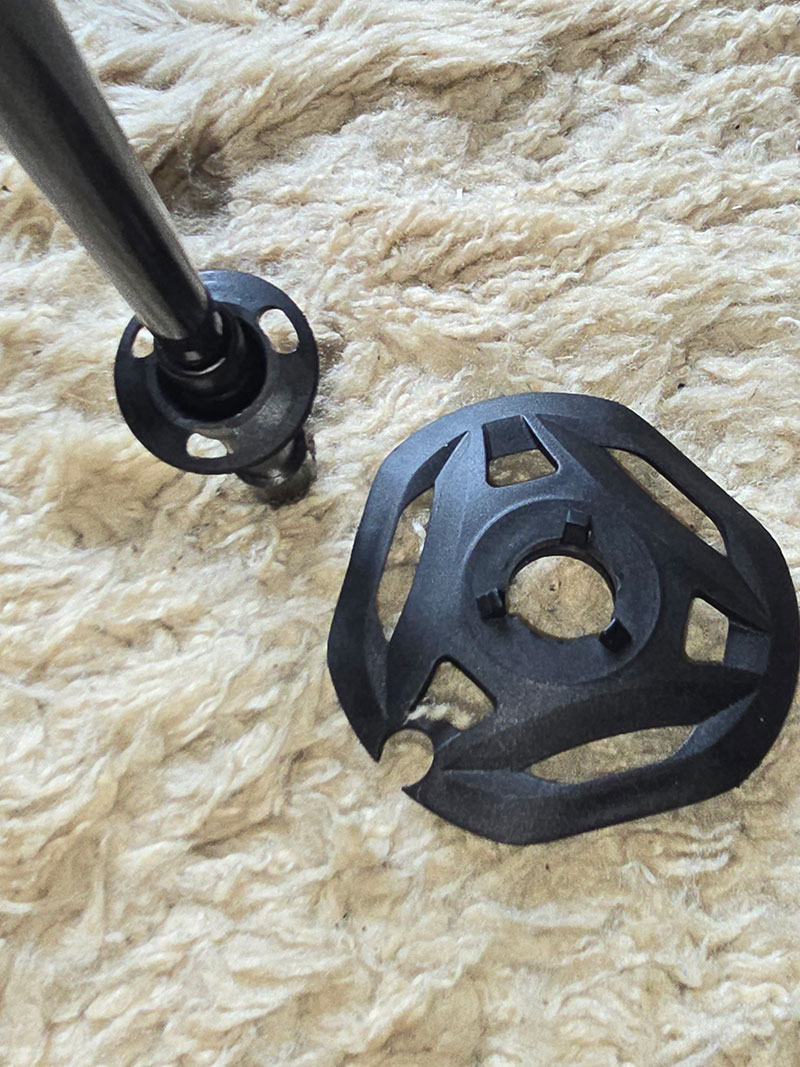 On arrival the poles came with a pair of ice-flex baskets clipped between the poles. These baskets clip into place by way of three lugs, and this is where you immediately notice a difference between the Komperdell Carbon C.2 Ultralight touring poles and standard walking poles; rather than clipping into a rigid, fixed, retainer these clip into a holder than allows up to 28° of movement. It's not until you're out on the snow and ice that this really makes sense, but once you're out there it's wonderful! With that amount of play you can almost forget about the angle you place your poles at as the baskets adjust to the surface under your feet, balancing whether it's uphill or downhill. The baskets add a little weight, taking the combined weight up to 444g but they are, quite simply, the best snow and ice baskets we've ever used and the main reason is this ability to flex to fit the terrain.