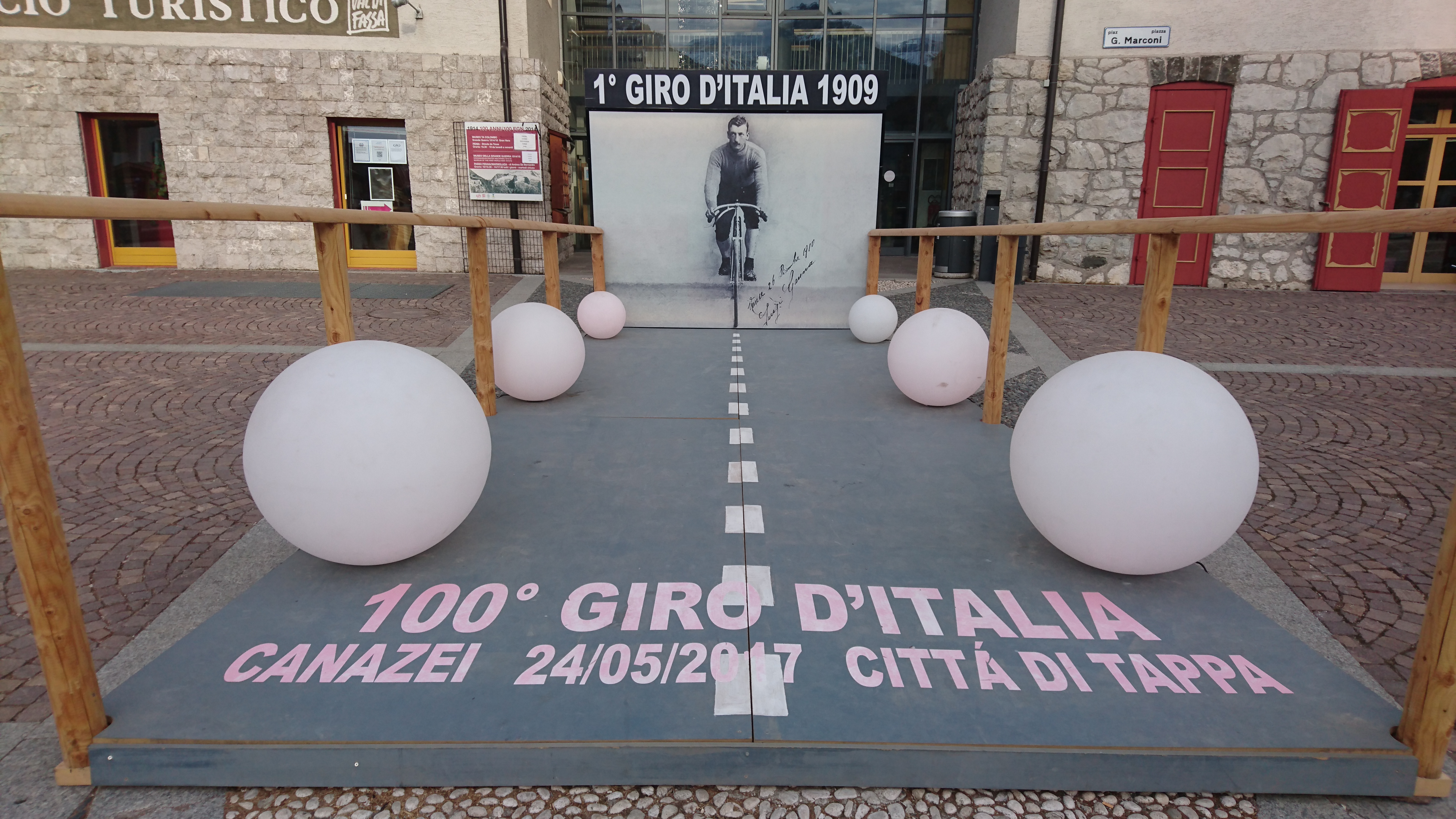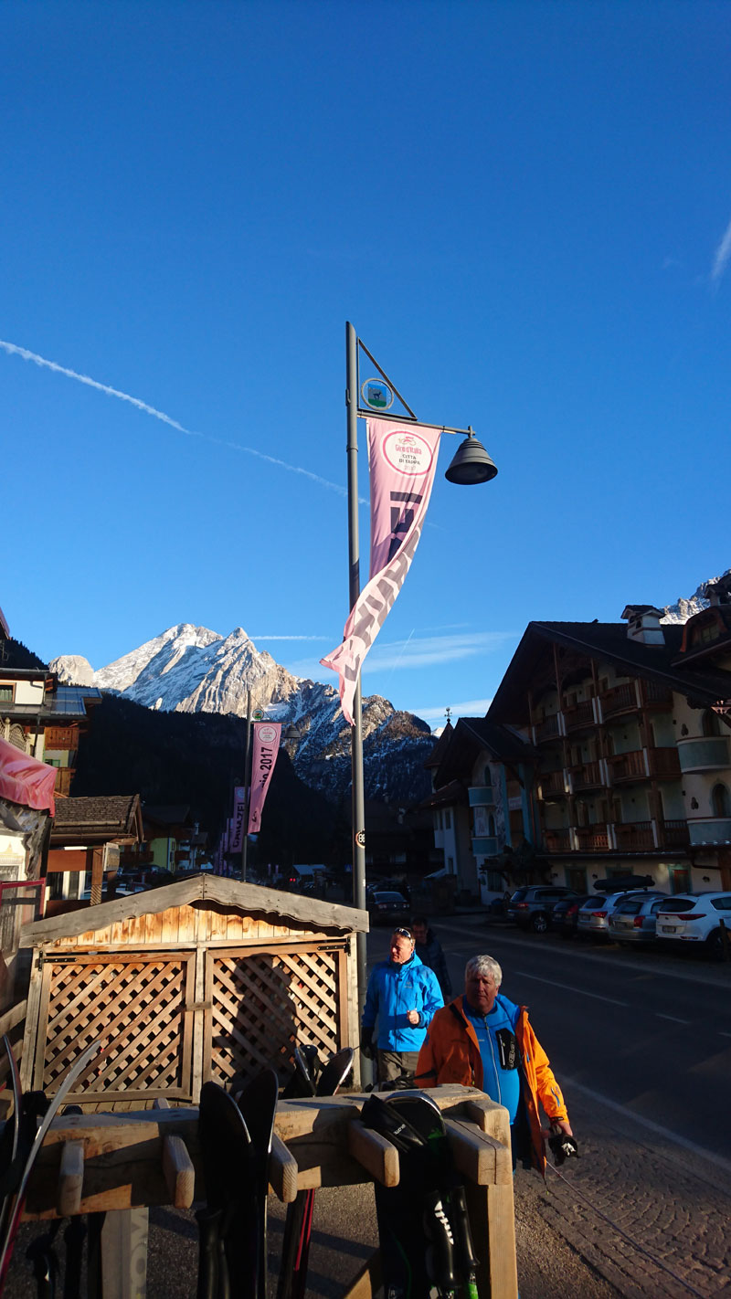One thing I got very excited about was the pink bunting everywhere. Canazei was hosting a stage finish of the Giro D'Italia just a few weeks later. There was a second stage passing through the next day en route to the Passo Pordoi. To see the trapping of a grand tour whilst people carried skis was a bit strange to be fair but I savoured it.