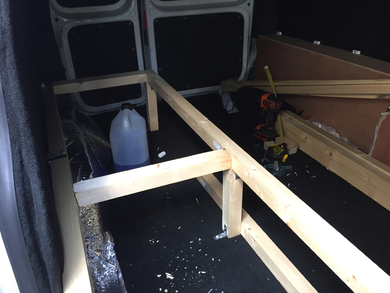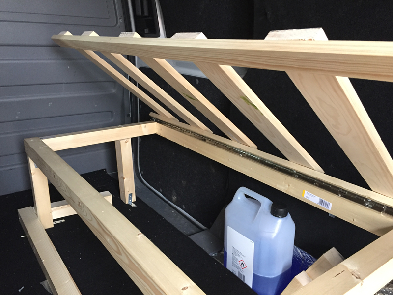 It was at the stage of attaching the top frame, with all the slats, to the base that I realised the bulkhead wasn't vertical and my eyes and measurements had deceived me. The bulhead behind the drivers seat follows the contours of the rear of the seat, meaning the lid wouldn't fully open! Every one of the 20 attachments points had to be undone and the bed taken out.