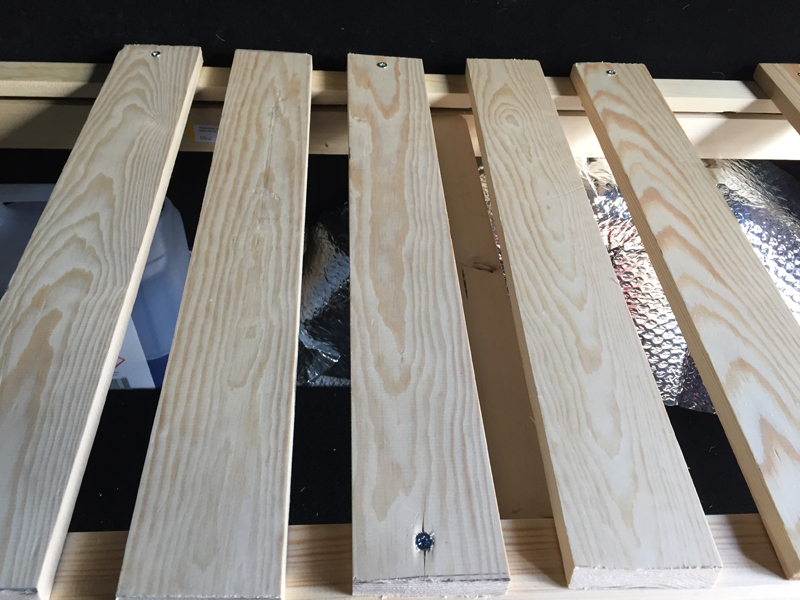 After checking the frame fitted, leaving space at the end of the bed for other plans, everything was well ahead of my early-june deadline. With the 50cm wide base the extension would be 40cm, following the classic slatted style. An upper fram, attached to the main frame with two 90cm piano hinges, allows the sleeping platform to be raised, giving access to the under-bed storage.