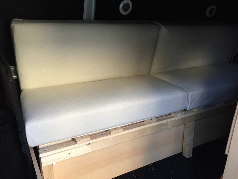 With a limited budget and a futile search through my contacts for someone adept with a sewing machine the cushion covers ended up being hand sewn. That's 8 hours of hand sewing to complete the 4 foam cushions and let's just say the covers will never be taken as professionally made - but there's no denying it added to the "I made this" feel that was always intended. If I'd wanted a "professional" conversion with factory cushions and units I'd end up with a van than looked like any other, just a little smaller.