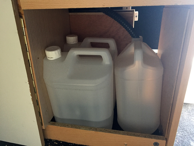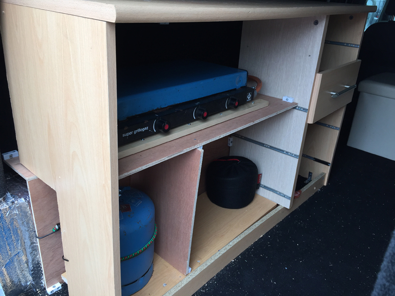 The unit that holds the cooker and sink started life as a set of drawers...after 2 house moves the drawers were collapsing and the unit had been relegated to the garage as a stoage unit for tools. At 1m wide they were an almost perfect fit opposite the bed, with room to access through the side door.