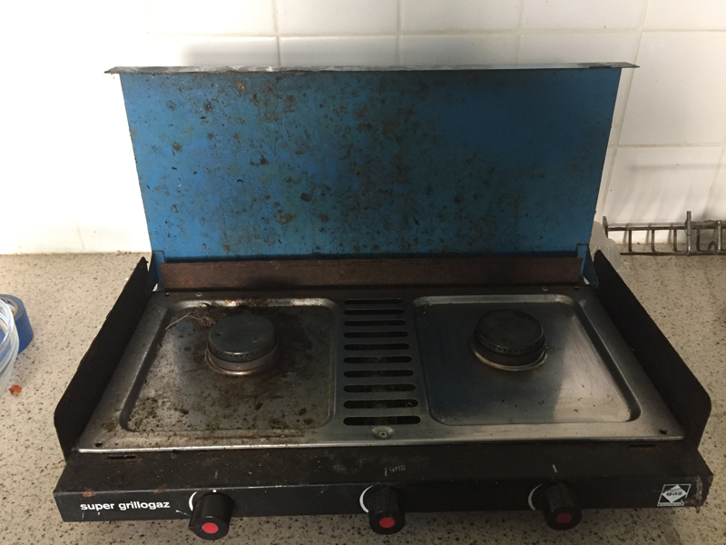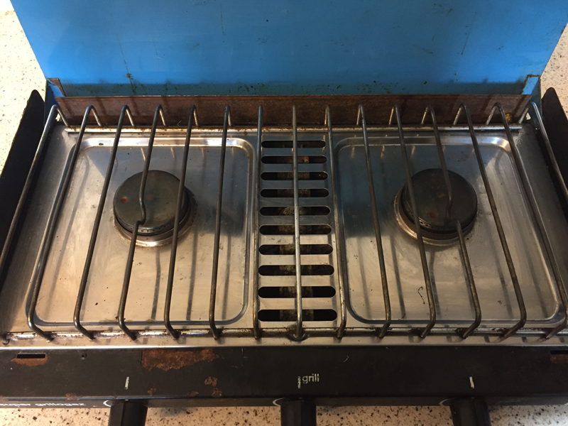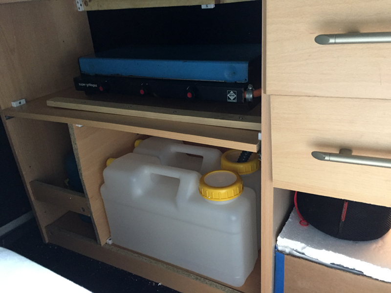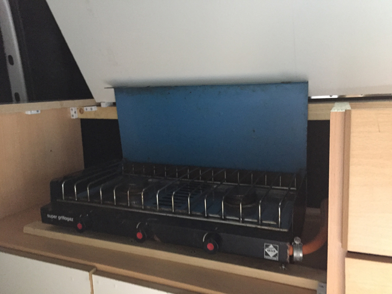 The double burner Camping Gaz stove started life sometime over 30 years ago and had been sat in the garage for 9 years because "it will come in handy one day" and to be honest it was in an awful state. But a quick clean up soon had it ready for use and sitting on the unit shelf, complete with batons to prevent any movement during driving. To give sufficient clearance for the rising heat from the stove the worksurface above has to be able to lift through almost 90 degrees and sit against the wall. This was the a problem at first, but a quick tweak meant the MDF that replaced the worksurface came in two pieces - a narrow strip fixed in place and a main piece that was far enough away from the doors to lift properly.