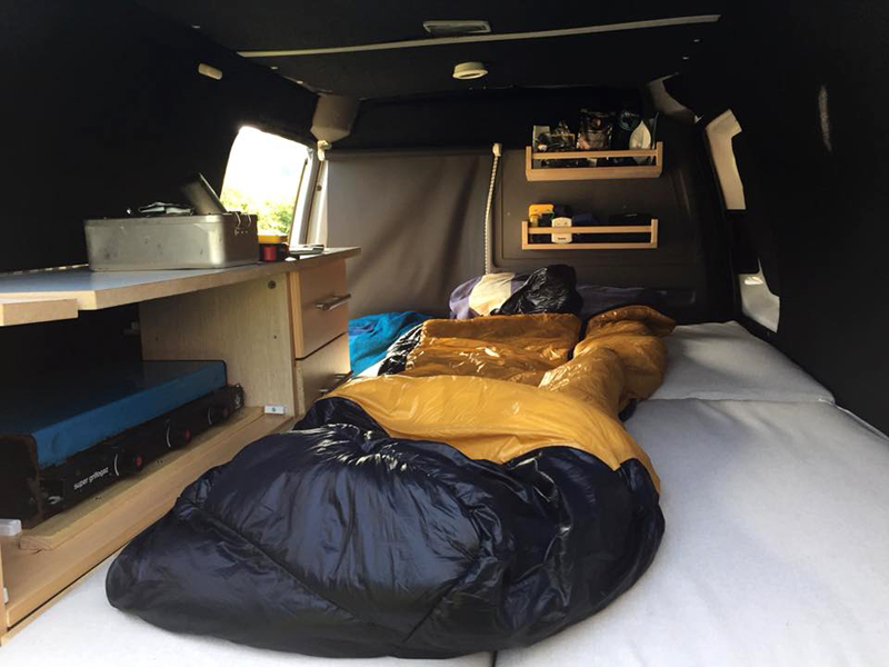 An £8 blackout blind and 3 Ikea spice racks at £3 each were added following a first real-world trip to Castleton, giving protection from the dawn light and an early awakening and storage for food tins, power banks and other essentials.