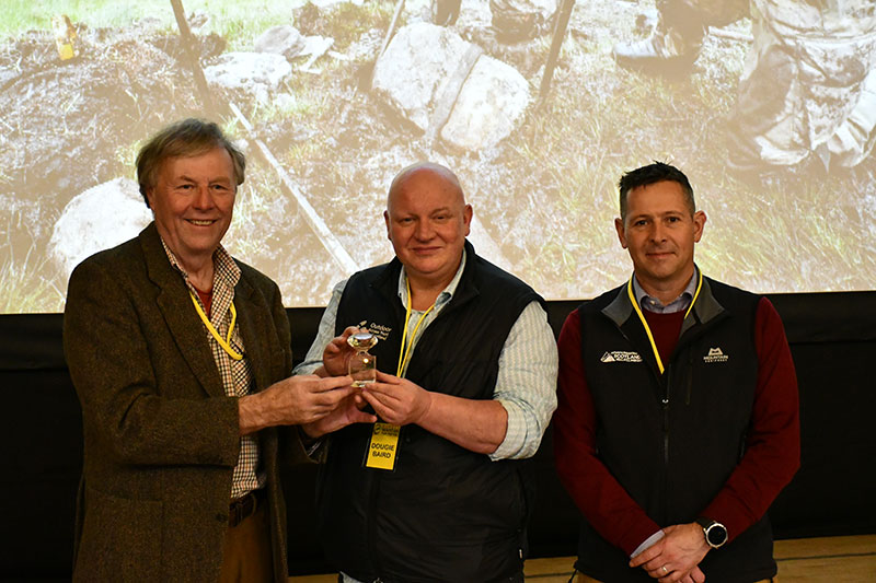 Scottish Mountain Trust Chair, John Fowler, presenting OATS CEO Dougie Baird and Scottish Mountaineering CEO Stuart Younie with the Diamond Grant at the Dundee Mountain Film Festival