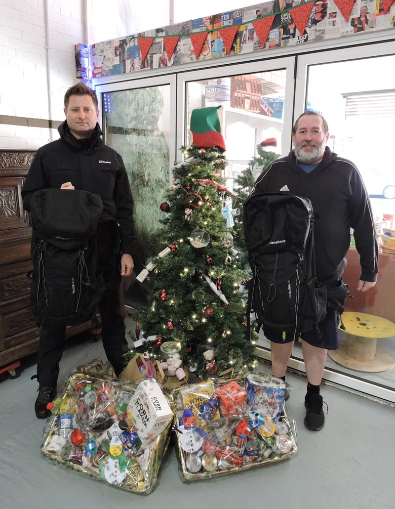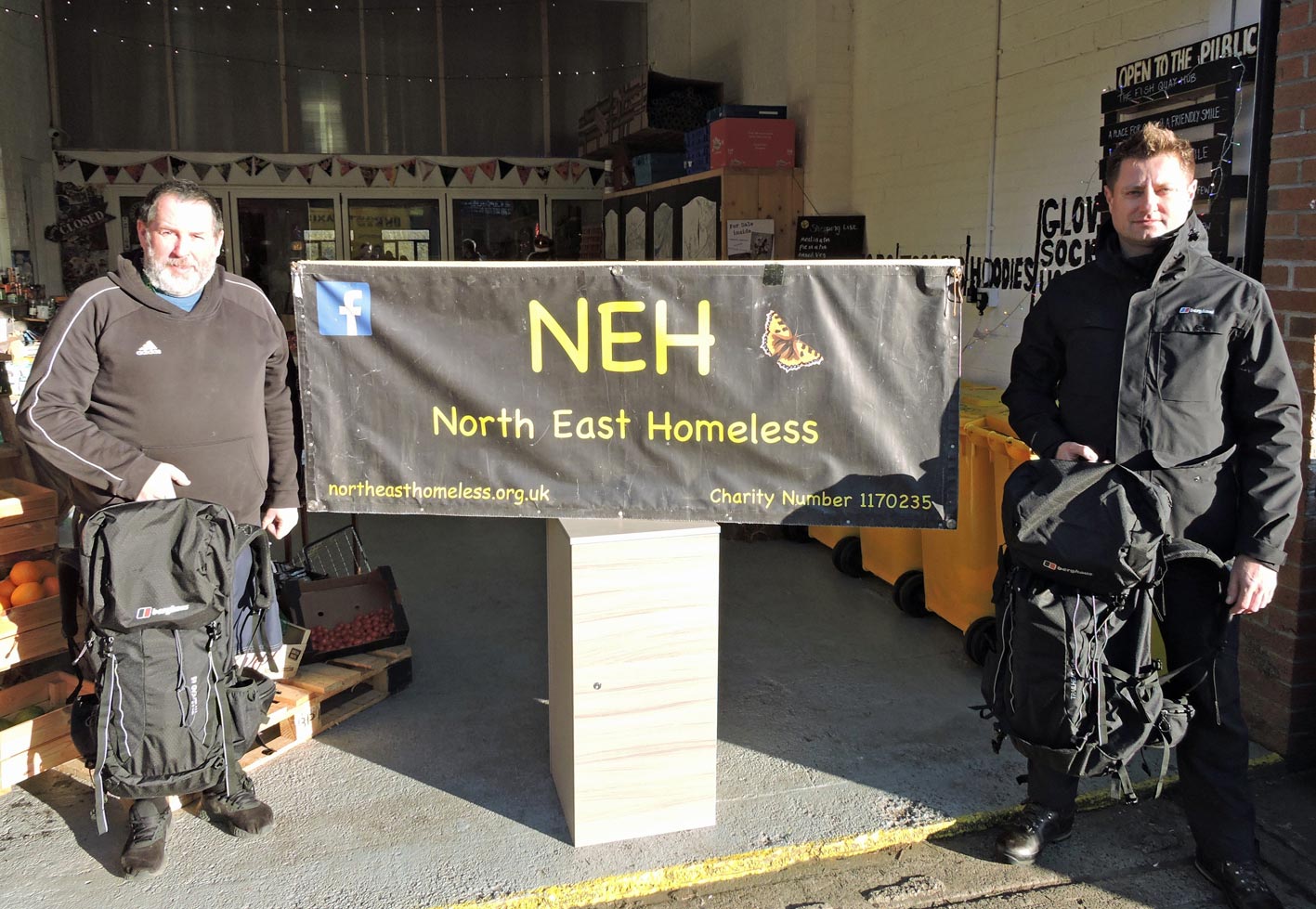 George Clarke (left) and Brian Burridge of North East Homeless with Berghaus rucksacks that will be used by charity volunteers over Christmas